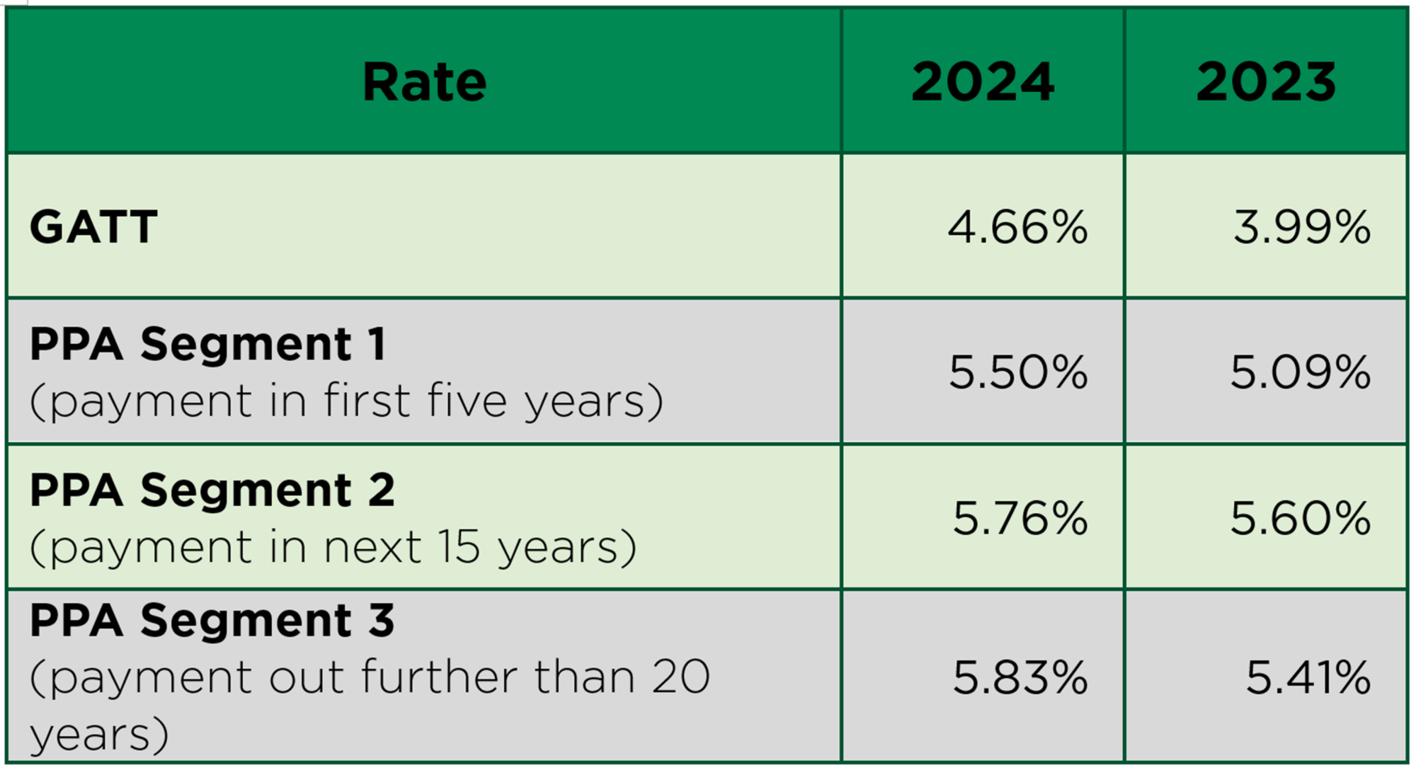Each interest rate is used in combination with a different mortality table, which can have a significant effect on the amount of the benefit as a single cash payment.