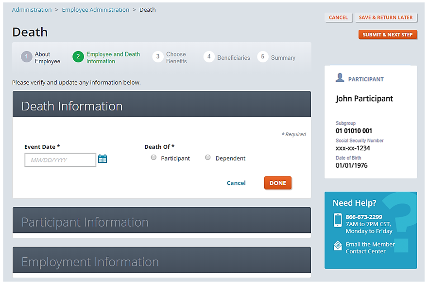 The latest enhancement to the NRECA Employee Benefits website is an updated death event. This event notifies NRECA and provides information needed to process benefits when a participant or dependent has died. Instead of two different events for reporting participant and dependent deaths, there is now a single, consolidated experience. Benefits administrators (BA) will find this combined event under Employee Administration > Death.